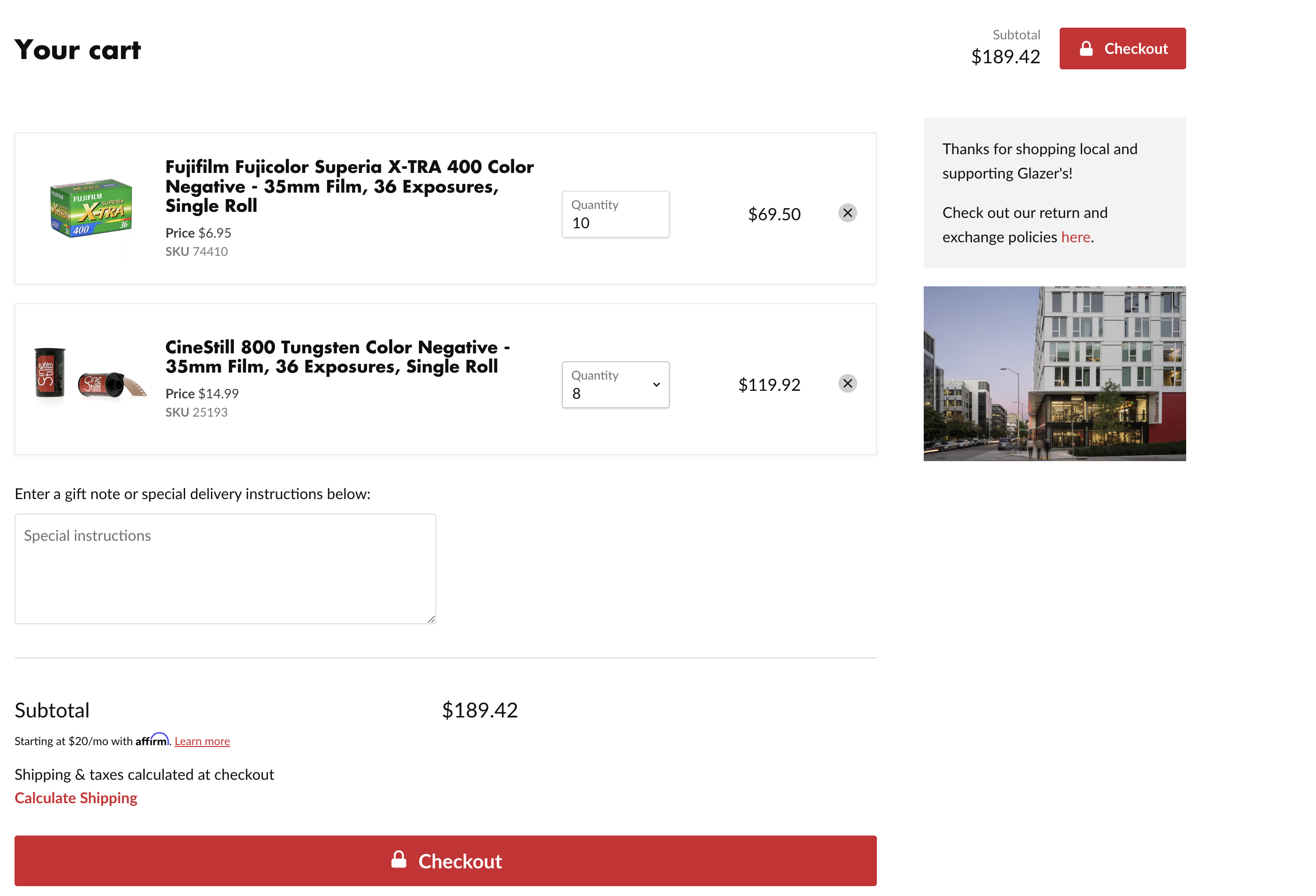 fuji xtra400 해당 필름 10개와 https://www.glazerscamera.com/products/cinestill-800-tungsten-35mm-36?variant=35176539357229 cinestill 800t 해당필름 8개로 총 189.42$ 몰테일 델라웨어 배송대행지로 구매하고싶습니다 델라웨어 주소 이름 : Woojin SimSTREET ADDRESS 1 적는 칸에 : 312 Cherry LaneSTREET ADDRESS 2 적는 칸에 : #KT55542(# 특수문자가 적용되지 않는곳은 빼고 등록해주세요)City 이름은 : New CastleState 주 이름은 : DE 혹은 DelawareZip code 우편번호는 : 19720 혹은 19720-2784Phone 전화번호를 적는 칸에 : 302-999-9961 |
