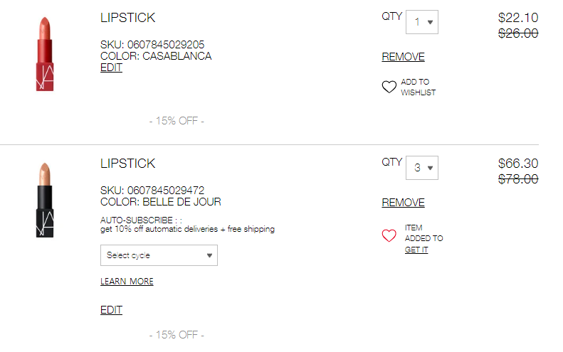 Nars LIPSTICK SKU: 0607845029205 COLOR: CASABLANCA, LIPSTICK SKU: 0607845029472 COLOR: BELLE DE JOUR