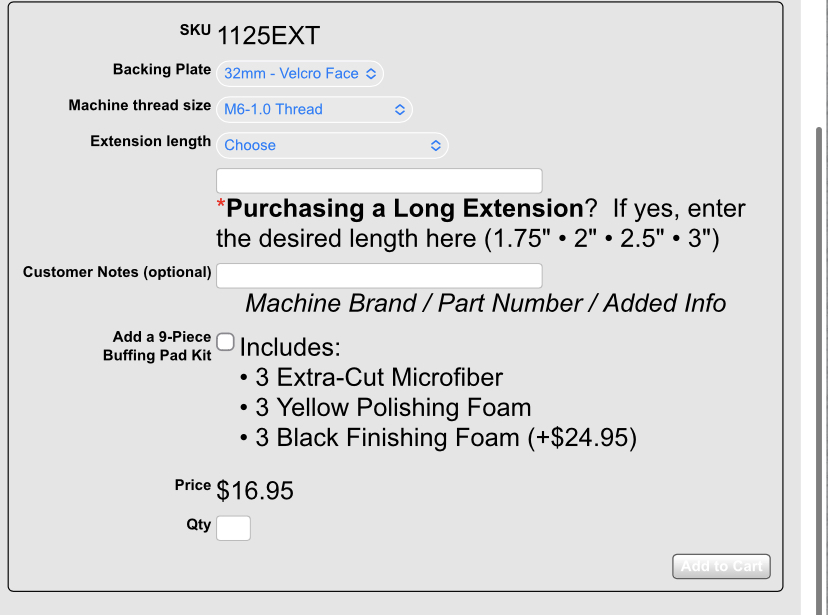 옵션에서 Backing Plate와 Machine thread size는 이미지 첨부한 대로 통일해주시고 Extension length를 Adaptor 1개, Short Extension 1개, Medium Extension 2개, Long Extension 2개씩 구매한다면 견적이 어떻게 나올지 알려주세요 |
