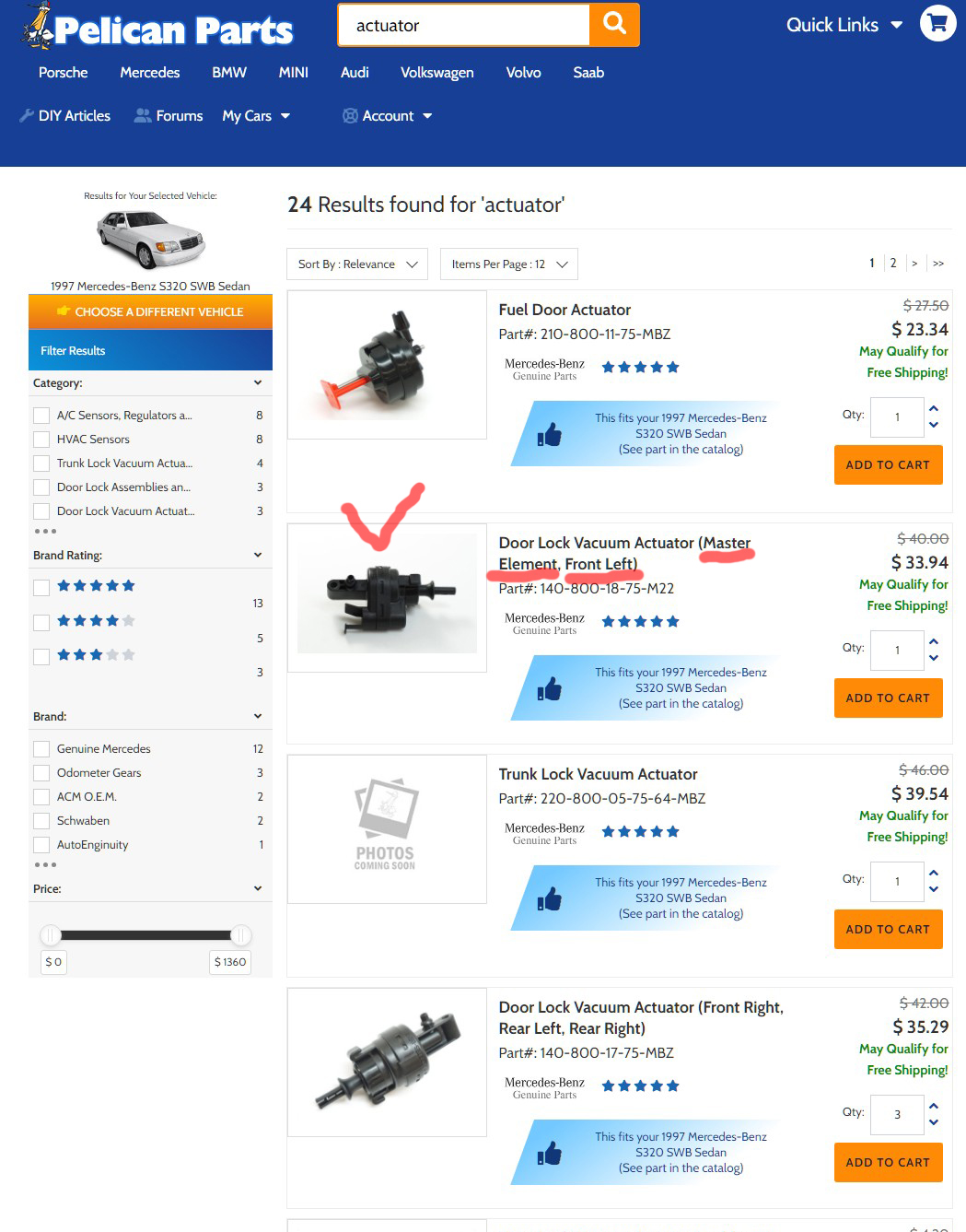 판매처 : 미국 Pellican Parts Door Lock Vacuum Actuator (Master Element, Front Left) PART#. ; 140-800-18-75-M22 Qty : 1 US $33.94 참고 - 운송료 포함금액 US $66.25 (USPS Priority Express)인데요 배송시간 등은 모르겠습니다 그럼 소식 기다립니다. 수고하세요 |