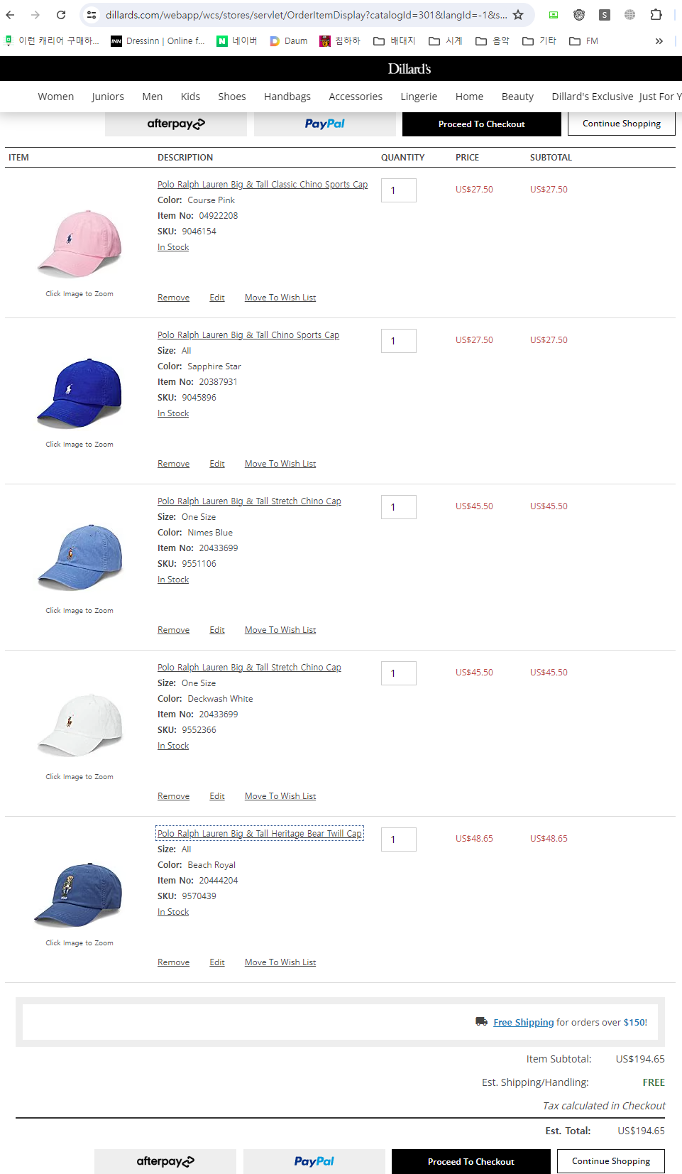 Color Course Pink https://www.dillards.com/p/polo-ralph-lauren-big--tall-chino-sports-cap/516848756 Color Sapphire Star https://www.dillards.com/p/polo-ralph-lauren-big--tall-stretch-chino-cap/517595226 Color Nimes Blue https://www.dillards.com/p/polo-ralph-lauren-big--tall-stretch-chino-cap/517595226 Color Deckwash White https://www.dillards.com/p/polo-ralph-lauren-big--tall-heritage-bear-twill-cap/517775741 Color Beach Royal 총 194.65달러 입니다. 구매 견적 부탁드립니다. |