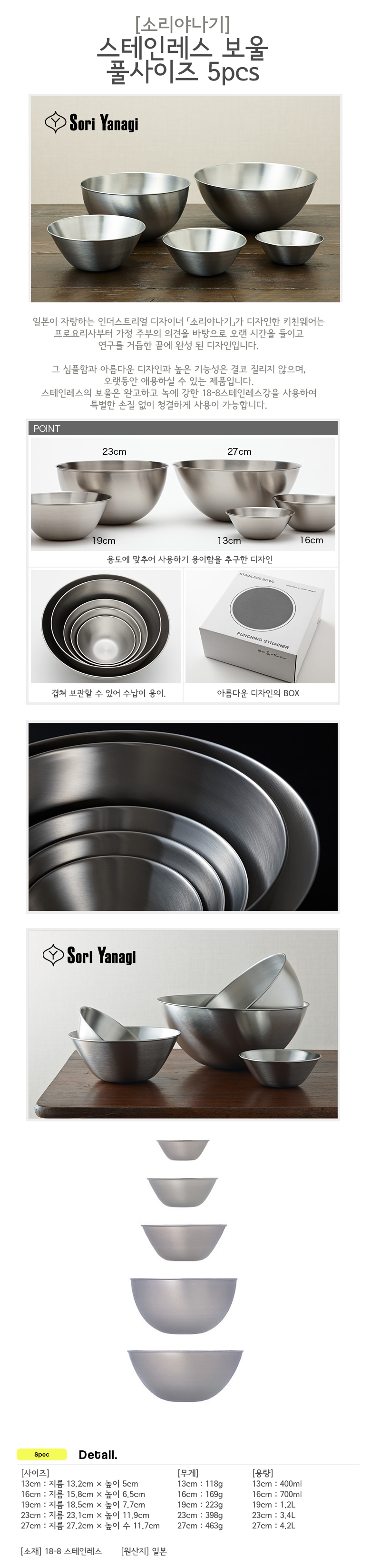 소리야나기 YANAGI SORI 스테인리스 볼 풀사이즈 5종 세트 일본제 13cm 16cm 19cm 23cm 27cm 스테인리스 볼 선물용 기프트 소리야나기 YANAGI SORI 스테인리스 볼 풀사이즈 5종 세트 일본제 13cm 16cm 19cm 23cm 27cm...