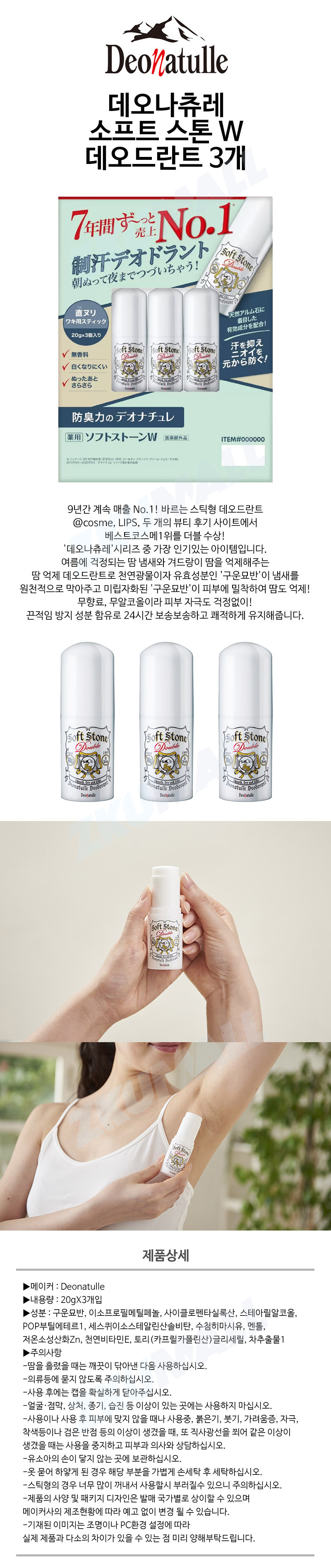 샀고 데오나츄레 소프트스톤은 땀이랑 체취를 억제하는 기능에 스킨 케어 성분이 포함되어 있어서 피부 보호하고 보습에도 도움을 준다고 해서 나처럼 평소에 데오드란트 안썼던 분들이라도 입문템으로도...