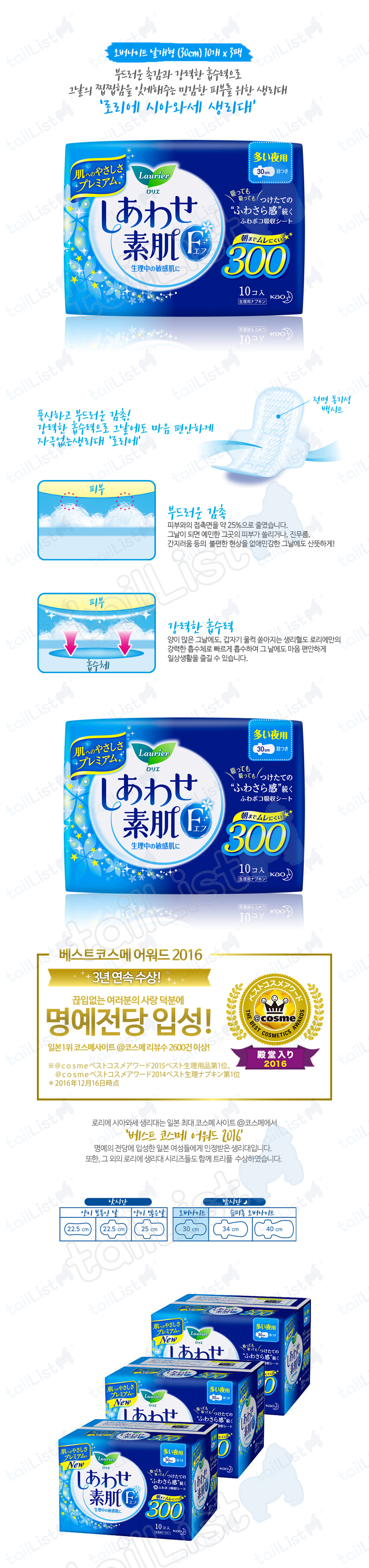 종류[카오] 로리에 시아와세 생리대 오버나이트 30cm 10개 3팩(총30개)